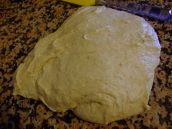 Elde ise tuz ve zeytinler hariç tüm malzemeler karıştırma kabında tahta spatula ile iyice karıştırıldıktan sonra çalışma tezgahında "Temel Teknikler/Görüntülü kayıtlar/Hamur Yoğurma Tekniği"ne uygun olarak en az 15-20 dakika boyunca yoğrulmalıdır. Tuz, ilk 5 dk.lık yoğurmanın sonunda 5 dk. bekledikten sonra ilave edilmeli, arkasından hamur elastik ve plastik bir kıvam alana kadar yaklaşık 15 dk. boyunca yoğrulmalıdır. Yoğurmanın son 5 dk.sında zeytinler karıştırılır.